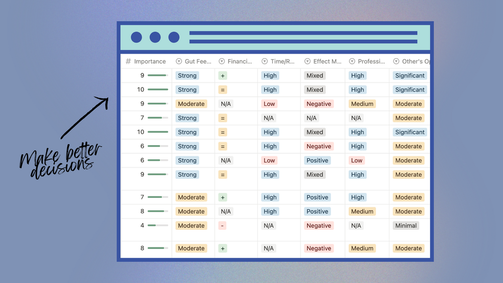 Solid decision-making is a life skill. And tracking you past choices is the first step to learning from them. Overtime, you’ll spot patterns and it will improve your personal decision-making framework so you can make the best choices based on your own data.