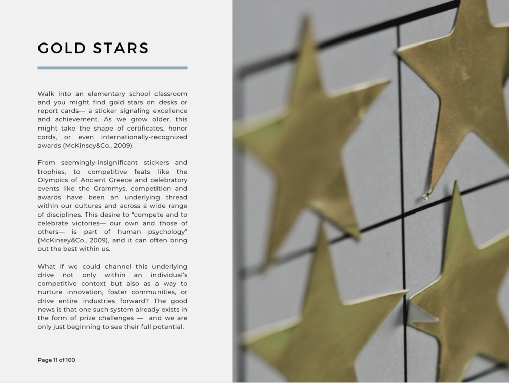 The 90-page guidebook provides an in-depth analysis of prize architecture and a practical, 9-element framework for designing your own prize challenge to meet your specific business objectives — along with various case studies, worksheets, and helpful tips. It will help you decide on running a more product-centric vs. a community-centric prize challenge, how to choose the best incentivize based on your target audience, and how to think about judging criteria, marketing, and recognition ceremonies for your challenge — covering everything from conception to design to execution.