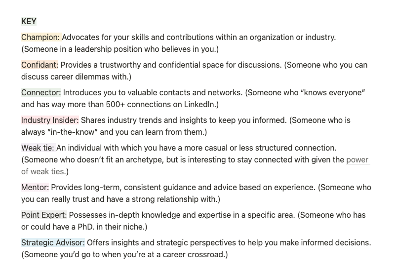- Archetype key (with definition of core roles like "mentor," "point expert," or "champion") to better categorize your connections.