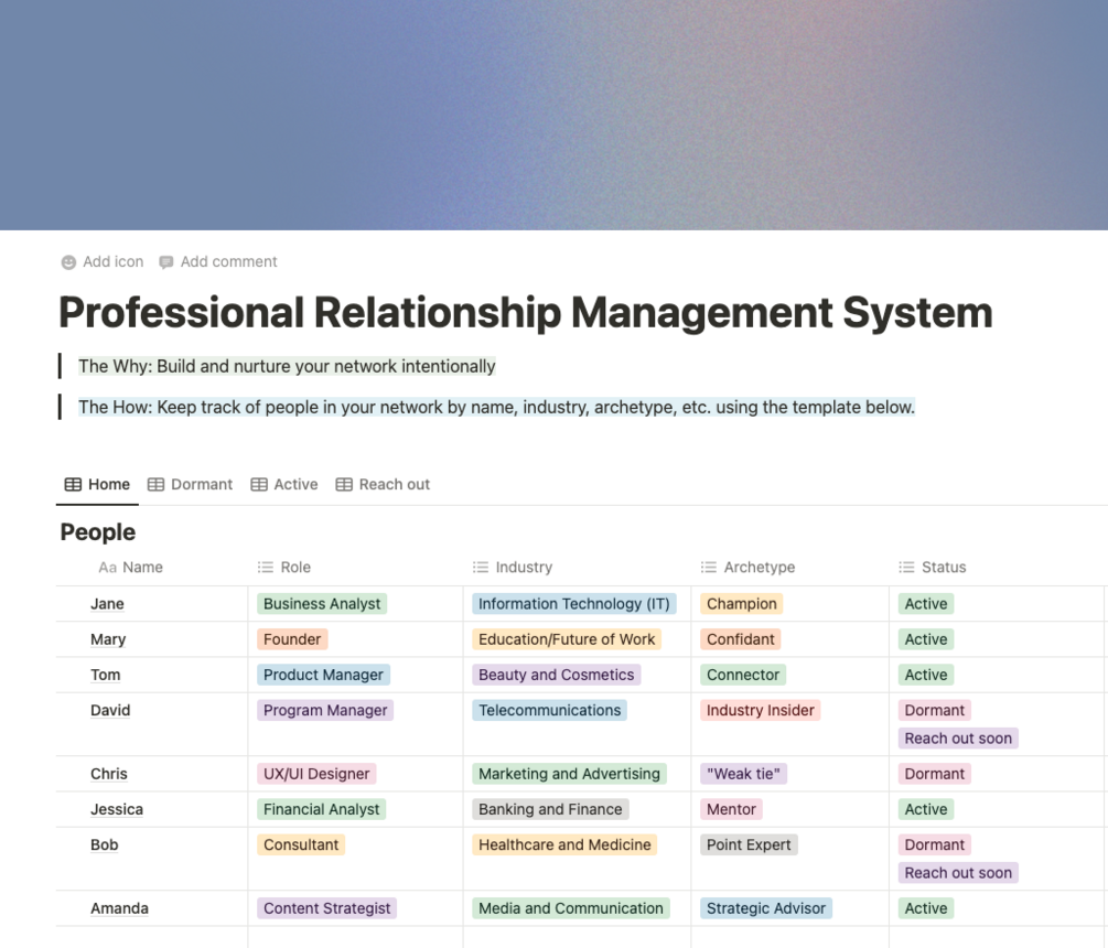 - Archetype key (with definition of core roles like "mentor," "point expert," or "champion") to better categorize your connections.